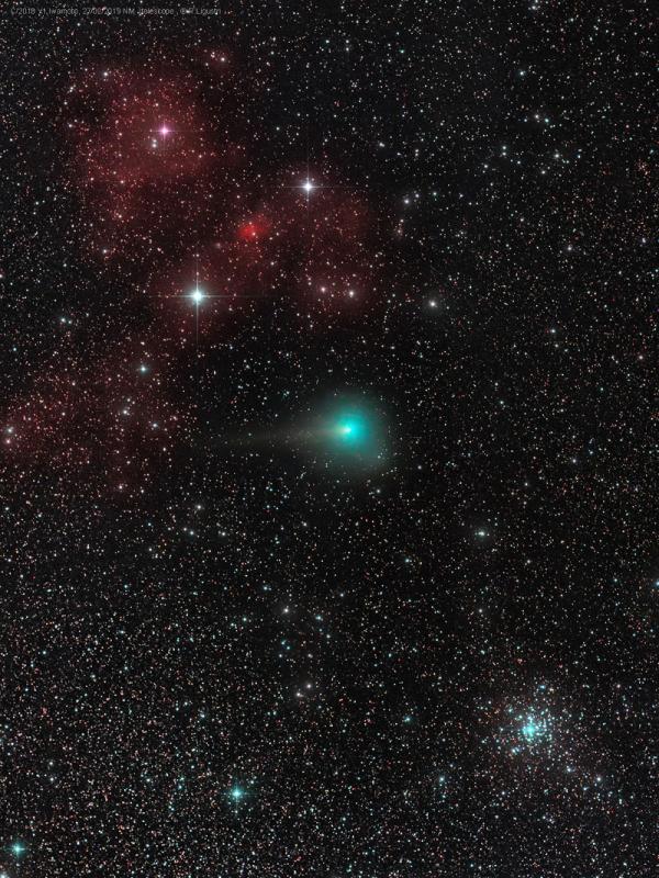 Still racing across planet Earth's night skies, Comet Iwamoto (C/2018 Y1) shares this pretty telescopic field of view with stars and nebulae of northern constellation Auriga, the Charioteer. Captured on February 27, Iwamoto's greenish coma and faint tail appear between a complex of reddish emission nebulae and open star cluster M36 (bottom right). The reddish emission is light from hydrogen gas ionized by ultraviolet radiation from hot stars near the region's giant molecular cloud some 6,000 light-years distant. The greenish glow from the comet, less than 5 light-minutes away, is predominantly emission from diatomic carbon molecules fluorescing in sunlight. M36, one of Auriga's more familiar star clusters, is also a background object far beyond the Solar System, about 4,000 light-years away. Comet Iwamoto passed closest to Earth on February 12 and is outward bound in a highly elliptical orbit that will carry it beyond the Kuiper belt. With an estimated orbital period of 1,317 years it should return to the inner Solar System in 3390 AD.