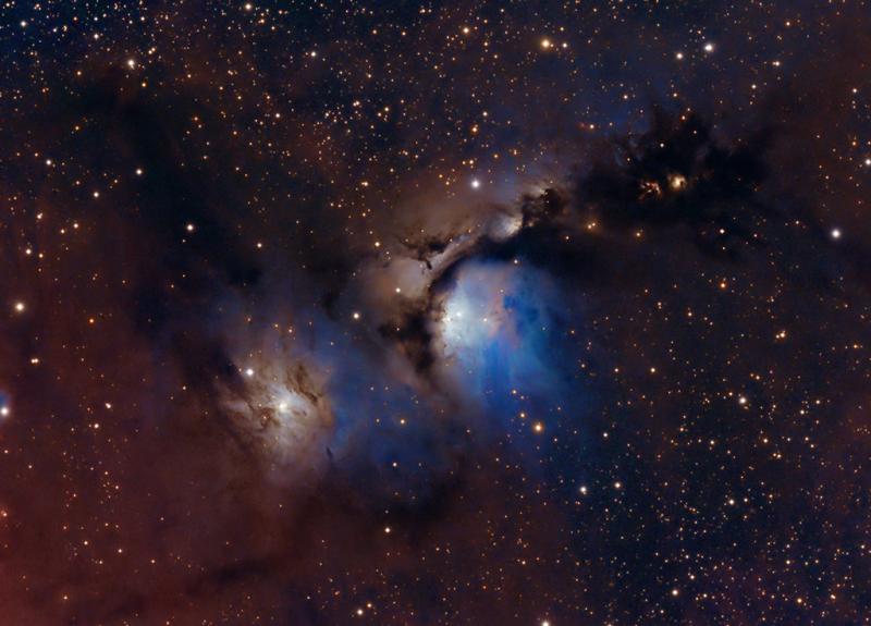 Interstellar dust clouds and bright nebulae abound in the fertile constellation of Orion. One of the brightest, M78, is near the center in this colorful telescopic view, covering an area north of Orion's belt. At a distance of about 1,500 light-years, the bluish nebula itself is about 5 light-years across. Its blue tint is due to dust preferentially reflecting the blue light of hot, young stars in the region. Dark dust lanes and other nebulae can easily be traced through the gorgeous skyscape that includes many Herbig- Haro objects, energetic jets from stars in the process of formation. But missing from this image is McNeil's nebula. A major discovery only recognized in 2004, the enigmatic, variable nebula was found along the dark lane of dust above and right of larger M78. McNeil's nebula is associated with a protostar and seen to be sometimes present and sometimes absent in photos of the well-imaged region. McNeil's nebula faded from view late last year and is still absent in this deep image recorded in February 2019.