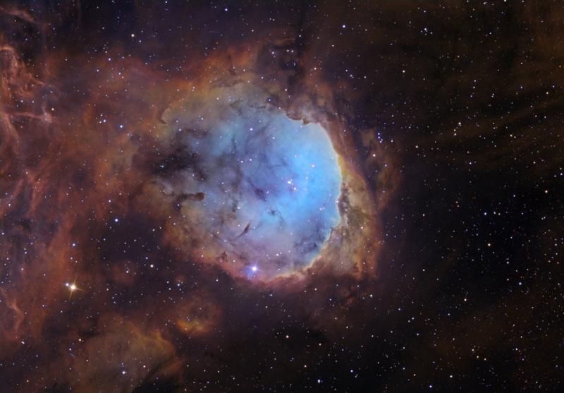 This bright cosmic cloud was sculpted by stellar winds and radiation from the hot young stars of open cluster NGC 3324. With dust clouds in silhouette against its glowing atomic gas, the pocket-shaped star-forming region actually spans about 35 light-years. It lies some 7,500 light-years away toward the nebula rich southern constellation Carina. A composite of narrowband image data, the telescopic view captures the characteristic emission from ionized sulfur, hydrogen, and oxygen atoms mapped to red, green, and blue hues in the popular Hubble Palette. For some, the celestial landscape of bright ridges of emission bordered by cool, obscuring dust along the right side create a recognizable face in profile. The region's popular name is the Gabriela Mistral Nebula for the Nobel Prize winning Chilean poet.