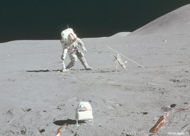Score three points for NASA. With time running out late in Apollo 15's mission to the Moon in 1971, Astronaut David Scott prepared to split the uprights and bring about yet another dramatic end-of-the-mission victory for NASA. Scott used a special lunar football designed for the rugged games held on the Moon. R1-D1, a predecessor to R2-D2, cheered from the sideline. Happy April Fools' Day from the folks at APOD. In reality, Astronaut Scott placed a drill that measured how temperature changed with lunar depth. The foreground device actually detected high-energy particles that escaped from the Sun. No Joke: NASA Plans to Return to the Moon in the Next Five Years