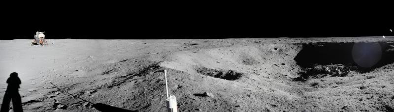 On July 20, 1969 the Apollo 11 lunar module Eagle safely touched down on the Moon. It landed near the southwestern corner of the Moon's Mare Tranquillitatis at a landing site dubbed Tranquility Base. This panoramic view of Tranquility Base was constructed from the historic photos taken from the lunar surface. On the far left astronaut Neil Armstrong casts a long shadow with Sun is at his back and the Eagle resting about 60 meters away ( AS11-40-5961). He stands near the rim of 30 meter-diameter Little West crater seen here to the right ( AS11-40-5954). Also visible in the foreground is the top of the camera intended for taking stereo close-ups of the lunar surface.