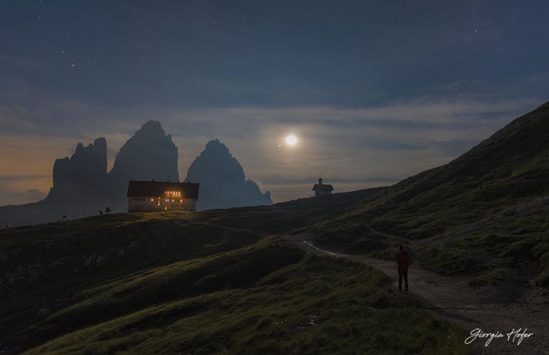 What are those bright lights in the sky ahead? When hiking a high mountain pass in northern Italy three weeks ago, a conjunction between our Moon and the distant planet Jupiter was visible as both rose together in the southwest after sunset. The picturesque mountains in the distance are Tre Cime di Lavaredo (Three Peaks of Lavaredo), a UNESCO World Heritage Site and three of the best known mountain peaks in Italy, the Dolomites, and the entire Alps. In the foreground on the left is Locatelli Hut, a refuge for tired hikers as it is located over an hour from nearest parking lot. The bright sky object on the upper left is Saturn. The entire scene was captured on a single 8-second exposure. Jupiter and Saturn will remain prominent in the western sky after sunset this month, while the Moon, in its monthly orbit around the Earth, will pass near Jupiter again in about four days.