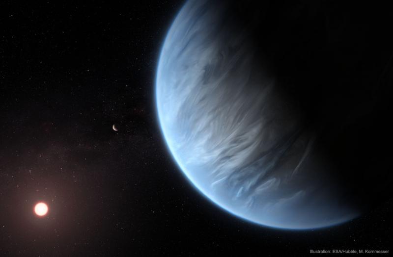 Where else might life exist? One of humanity's great outstanding questions, locating planets where extrasolar life might survive took a step forward recently with the discovery of a significant amount of water vapor in the atmosphere of distant exoplanet K2-18b. The planet and it parent star, K2-18, lie about 124 light years away toward the constellation of the Lion (Leo). The exoplanet is significantly larger and more massive than our Earth, but orbits in the habitable zone of its home star. K2-18, although more red than our Sun, shines in K2-18b's sky with a brightness similar to the Sun in Earth's sky. The discovery was made in data from three space telescopes: Hubble, Spitzer, and Kepler, by noting the absorption of water-vapor colors when the planet moved in front of the star. The featured illustration imagines exoplanet K2-18b on the right, its parent red dwarf star K2-18 on the left, and an unconfirmed sister planet between them.