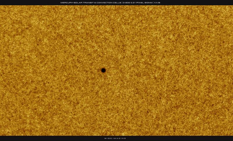 The small, dark, round spot in this solar close up is planet Mercury. In the high resolution telescopic image, a colorized stack of 61 sharp video frames, a turbulent array of photospheric convection cells tile the bright solar surface. Mercury's more regular silhouette still stands out though. Of course, only inner planets Mercury and Venus can transit the Sun to appear in silhouette when viewed from planet Earth. For this November 11, 2019 transit of Mercury, the innermost planet's silhouette was a mere 1/200th the solar diameter. So even under clear daytime skies it was difficult to see without the aid of a safe solar telescope. Following its transit in 2016, this was Mercury's 4th of 14 transits across the solar disk in the 21st century. The next transit of Mercury will be on November 13, 2032.