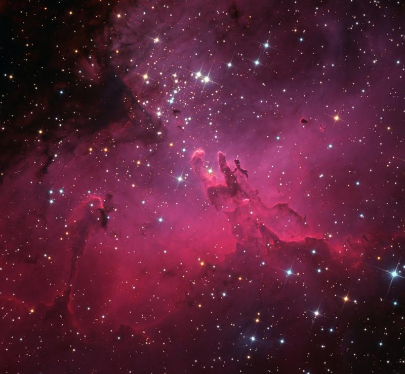 A star cluster around 2 million years young surrounded by natal clouds of dust and glowing gas, M16 is also known as The Eagle Nebula. This beautifully detailed portrait of the region was made with groundbased narrow and broadband image data. It includes cosmic sculptures made famous in Hubble Space Telescope close-ups of the starforming complex. Described as elephant trunks or Pillars of Creation, dense, dusty columns rising near the center are light-years in length but are gravitationally contracting to form stars. Energetic radiation from the cluster stars erodes material near the tips, eventually exposing the embedded new stars. Extending from the ridge of bright emission at lower left is another dusty starforming column known as the Fairy of Eagle Nebula. M16 lies about 7,000 light-years away, an easy target for binoculars or small telescopes in a nebula rich part of the sky toward the split constellation Serpens Cauda (the tail of the snake).