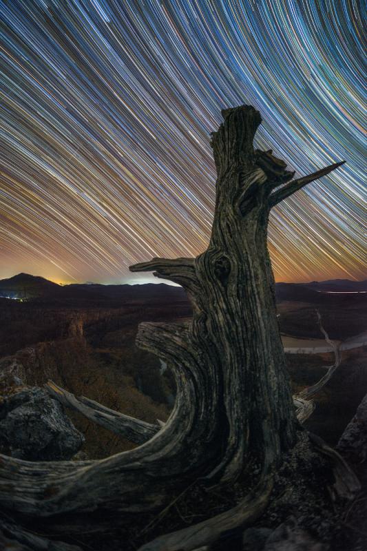 In time stars trace lines through the night sky on a rotating planet. Taken over two hours or more, these digitally added consecutive exposures were made with a camera and wide angle lens fixed to a tripod near Orel farm, Primorsky Krai, Russia, planet Earth. The stars trail in concentric arcs around the planet's south celestial pole below the scene's horizon, and north celestial pole off the frame at the upper right. Combined, the many short exposures also bring out the pretty star colours. Bluish trails are from stars hotter than Earth's Sun, while yellowish trails are from cooler stars. A long time ago this tree blossomed, but now reveals the passage of time in the wrinkled and weathered lines of its remains.