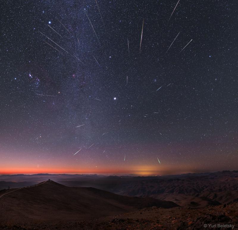 Are meteors streaming out from a point in the sky? Yes, in a way. When the Earth crosses a stream of Sun-orbiting meteors, these meteors appear to come from the direction of the stream -- with the directional point called the radiant. An example occurs every mid-December for the Geminids meteor shower, as apparent in the featured image. Recorded near the shower's peak in 2013, the featured skyscape captures Gemini's shooting stars in a four-hour composite from the dark skies of the Las Campanas Observatory in Chile. In the foreground the 2.5-meter du Pont Telescope is visible as well as the 1-meter SWOPE telescope. The skies beyond the meteors are highlighted by Jupiter, seen as the bright spot near the image center, the central band of our Milky Way Galaxy, seen vertically on the image left, and the pinkish Orion Nebula on the far left. Dust swept up from the orbit of active asteroid 3200 Phaethon, Gemini's meteors enter the atmosphere traveling at about 22 kilometers per second. The 2019 Geminid meteor shower peaks again this coming weekend.