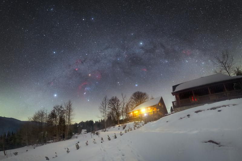 December's New Moon brought a solar eclipse to some for the holiday season. It also gave beautiful dark night skies to skygazers around the globe, like this moonless northern winter night. In the scene, bright stars of the Winter Hexagon along the Milky Way are rising. Cosy mountain cabins in the snowy foreground are near the village of Oravska Lesna, Slovakia. The shining celestial beacons marking the well-known asterism are Aldebaran, Capella, Pollux (and Castor), Procyon, Rigel, and Sirius. This winter nightscape also reveals faint nebulae in Orion, and the lovely Pleiades star cluster. Slide your cursor over the image to trace the winter hexagon, or just follow this link.
