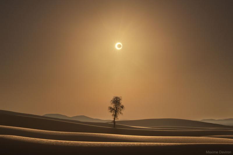 A good place to see a ring-of-fire eclipse, it seemed, would be from a desert. In a desert, there should be relatively few obscuring clouds and trees. Therefore late last December a group of photographers traveled to the United Arab Emirates and Rub al-Khali, the largest continuous sand desert in world, to capture clear images of an unusual eclipse that would be passing over. A ring-of-fire eclipse is an annular eclipse that occurs when the Moon is far enough away on its elliptical orbit around the Earth so that it appears too small, angularly, to cover the entire Sun. At the maximum of an annular eclipse, the edges of the Sun can be seen all around the edges of the Moon, so that the Moon appears to be a dark spot that covers most -- but not all -- of the Sun. This particular eclipse, they knew, would peak soon after sunrise. After seeking out such a dry and barren place, it turned out that some of the most interesting eclipse images actually included a tree in the foreground, because, in addition to the sand dunes, the tree gave the surreal background a contrasting sense of normalcy, scale, and texture. Explore the Universe: Random APOD Generator