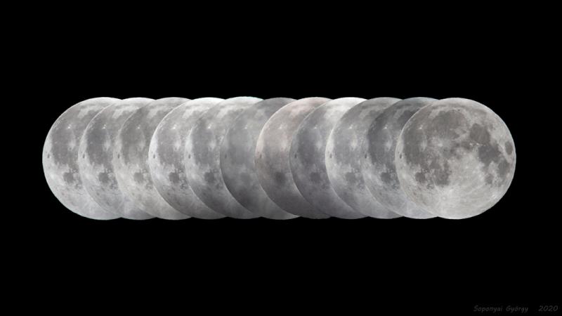 This composited series of images follows the Moon on January 10, the first Full Moon of 2020, in Hungarian skies. The lunar disk is in mid-eclipse at the center of the sequence though. It looks only slightly darker there as it passes through the light outer shadow or penumbra of planet Earth. In fact during this penumbral lunar eclipse the Moon almost crossed into the northern edge of Earth's dark central shadow or umbra. Subtle and hard to see, this penumbral lunar eclipse was the first of four lunar eclipses in 2020, all of which will be penumbral lunar eclipses.