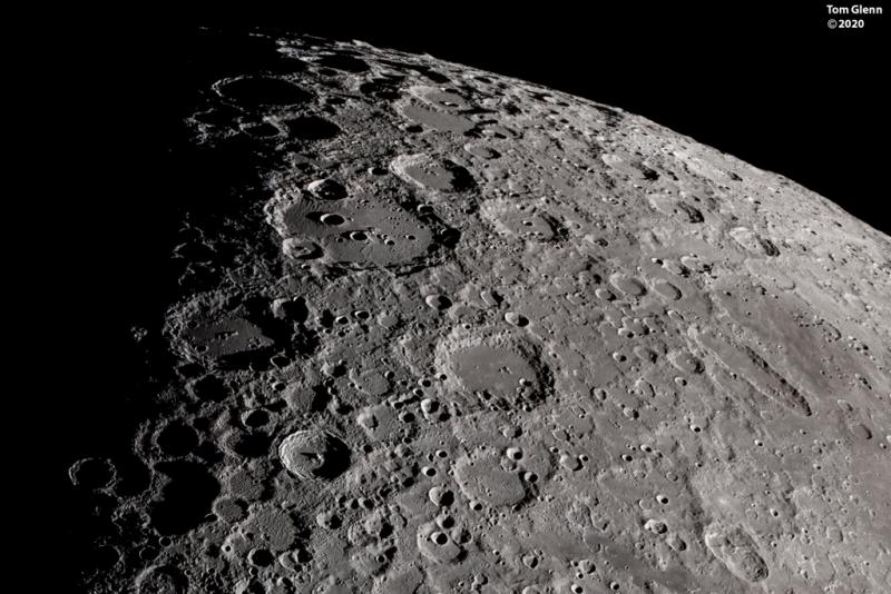 The Moon's south pole is near the top of this detailed telescopic view. Looking across the rugged southern lunar highlands it was captured from southern California, planet Earth. At the Moon's third quarter phase the lunar terminator, the sunset shadow line, is approaching from the left. The scene's foreshortened perspective heightens the impression of a dense field of craters and makes the craters themselves appear more oval shaped close to the lunar limb. Below and left of center is sharp-walled crater Tycho, 85 kilometers in diameter. Young Tycho's central peak is still in sunlight, but casts a long shadow across the crater floor. The large prominent crater to the south (above) Tycho is Clavius. Nearly 231 kilometers in diameter its walls and floor are pocked with smaller, more recent, overlaying impact craters. Mountains visible along the lunar limb at the top can rise about 6 kilometers or so above the surrounding terrain.