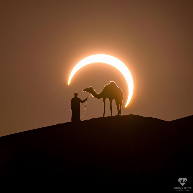 What's happening behind that camel? A partial eclipse of the Sun. About six and a half weeks ago, the Moon passed completely in front of the Sun as seen from a narrow band on the Earth. Despite (surely) many camels being located in this narrow band, only one found itself stationed between this camera, the distant Moon, and the even more distant Sun. To create this impressive superposition, though, took a well-planned trip to the United Arab Emirates, careful alignments, and accurate timings on the day of the eclipse. Although the resulting featured image shows a partially eclipsed Sun rising, the Moon went on to appear completely engulfed by the Sun in an annular eclipse known as a ring of fire. Forward scattering of sunlight, dominated by quantum mechanical diffraction, gives the camel hair and rope fray an unusual glow. The next solar eclipse is also an annular eclipse and will occur this coming June.