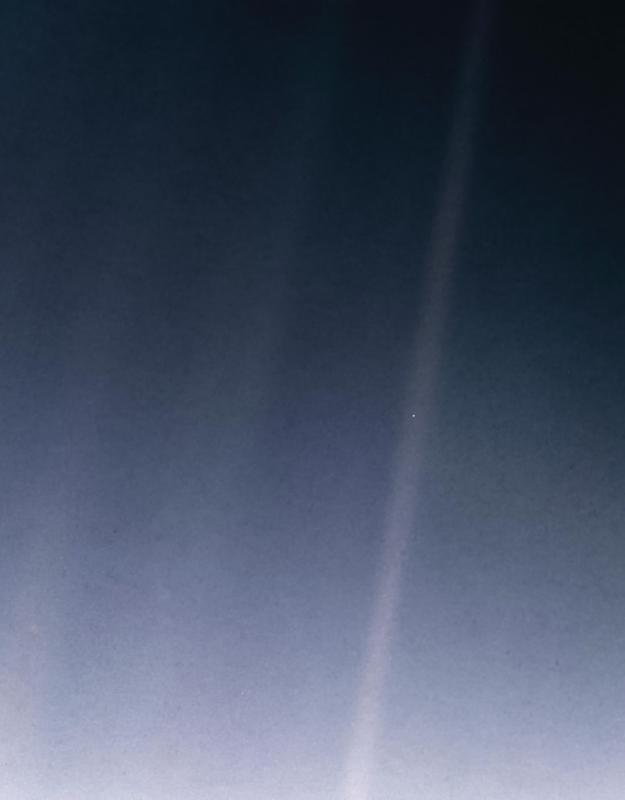 On Valentine's Day in 1990, cruising four billion miles from the Sun, the Voyager 1 spacecraft looked back one last time to make the first ever Solar System family portrait. The portrait consists of the Sun and six planets in a 60 frame mosaic made from a vantage point 32 degrees above the ecliptic plane. Planet Earth was captured within a single pixel in this single frame. It's the pale blue dot within the sunbeam just right of center in this reprocessed version of the now famous view from Voyager. Astronomer Carl Sagan originated the idea of using Voyager's camera to look back toward home from a distant perspective. Thirty years later, on this Valentine's day, look again at the pale blue dot.