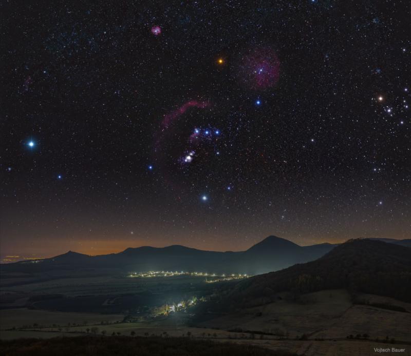 Do you recognize this constellation? Setting past the Central Bohemian Highlands in the Czech Republic is Orion, one of the most identifiable star groupings on the sky and an icon familiar to humanity for over 30,000 years. Orion has looked pretty much the same during this time and should continue to look the same for many thousands of years into the future. Prominent Orion is high in the sky at sunset this time of year, a recurring sign of (modern) winter in Earth's northern hemisphere and summer in the south. The featured picture is a composite of over thirty images taken from the same location and during the same night last month. Below and slightly to the left of Orion's three-star belt is the Orion Nebula, while four of the bright stars surrounding the belt are, clockwise, Sirius (far left, blue), Betelgeuse (top, orange, unusually faint), Aldebaran (far right), and Rigel (below). As future weeks progress, Orion will set increasingly earlier. Infinite Random Loop: Create an APOD Station in your classroom or Science Center.