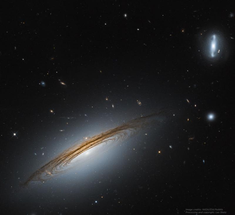 Why does this galaxy spin so fast? To start, even identifying which type of galaxy UGC 12591 is difficult -- featured on the lower left, it has dark dust lanes like a spiral galaxy but a large diffuse bulge of stars like a lenticular. Surprisingly observations show that UGC 12591 spins at about 480 km/sec, almost twice as fast as our Milky Way, and the fastest rotation rate yet measured. The mass needed to hold together a galaxy spinning this fast is several times the mass of our Milky Way Galaxy. Progenitor scenarios for UGC 12591 include slow growth by accreting ambient matter, or rapid growth through a recent galaxy collision or collisions -- future observations may tell. The light we see today from UGC 12591 left about 400 million years ago, when trees were first developing on Earth.