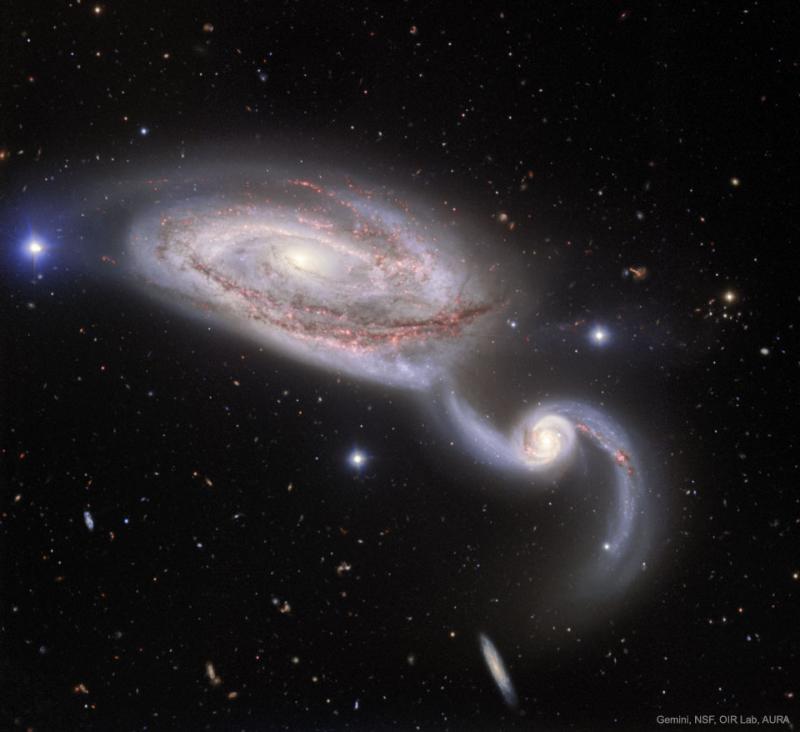 If you like slow dances, then this may be one for you. A single turn in this dance takes several hundred million years. Two galaxies, NGC 5394 and NGC 5395, slowly whirl about each other in a gravitational interaction that sets off a flourish of sparks in the form of new stars. The featured image, taken with the Gemini North 8-meter telescope on Maunakea, Hawaii, USA, combines four different colors. Emission from hydrogen gas, colored red, marks stellar nurseries where new stars drive the evolution of the galaxies. Also visible are dark dust lanes that mark gas that will eventually become stellar nurseries. If you look carefully you will see many more galaxies in the background, some involved in their own slow cosmic dances. APOD across world languages: Arabic, Catalan, Chinese (Beijing), Chinese (Taiwan), Croatian, Czech, Dutch, Farsi, French, French, German, Hebrew, Indonesian, Japanese, Korean, Montenegrin, Polish, Russian, Serbian, Slovenian, Spanish and Ukrainian