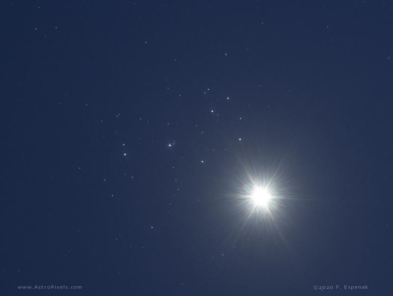After wandering about as far from the Sun on the sky as Venus can get, the brilliant evening star is crossing paths with the sister stars of the Pleiades cluster. Look west after sunset and you can share the ongoing conjunction with skygazers around the world. Taken on April 2, this celestial group photo captures the view from Portal, Arizona, USA. Even bright naked-eye Pleiades stars prove to be much fainter than Venus though. Apparent in deeper telescopic images, the cluster's dusty surroundings and familiar bluish reflection nebulae aren't quite visible, while brighter Venus itself is almost overwhelming in the single exposure. And while Venus and the Sisters do look a little star-crossed, their spiky appearance is the diffraction pattern caused by multiple leaves in the aperture of the telephoto lens. The last similar conjunction of Venus and Pleiades occurred nearly 8 years ago.
