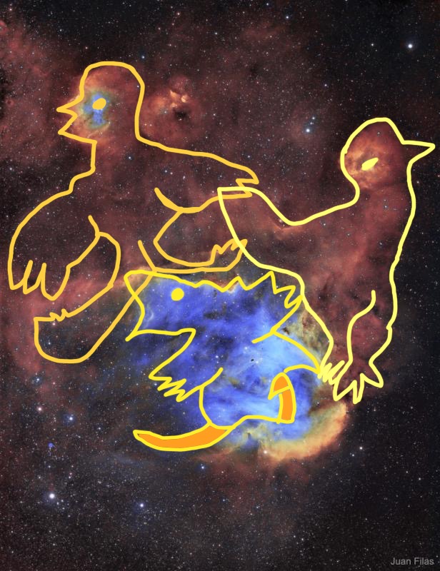 To some, it looks like a giant chicken running across the sky. To others, it looks like a gaseous nebula where star formation takes place. Cataloged as IC 2944, the Running Chicken Nebula spans about 100 light years and lies about 6,000 light years away toward the constellation of the Centaur (Centaurus). The featured image, shown in scientifically assigned colors, was captured recently in a 12-hour exposure. The star cluster Collinder 249 is visible embedded in the nebula's glowing gas. Although difficult to discern here, several dark molecular clouds with distinct shapes can be found inside the nebula.