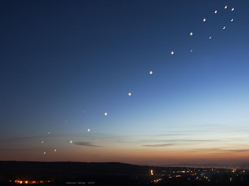 An analemma is that figure-8 curve you get when you mark the position of the Sun at the same time each day for one year. But the trick to imaging an analemma of the Moon is to wait bit longer. On average the Moon returns to the same position in the sky about 50 minutes and 29 seconds later each day. So photograph the Moon 50 minutes 29 seconds later on successive days. Over one lunation or lunar month it will trace out an analemma-like curve as the Moon's actual position wanders due to its tilted and elliptical orbit. To create this composite image of a lunar analemma, astronomer Gyorgy Soponyai chose a lunar month from March 26 to April 18 with a good stretch of weather and a site close to home near Mogyorod, Hungary. Crescent lunar phases too thin and faint to capture around the New Moon are missing though. Facing southwest, the lights of Budapest are in the distance of the base image taken on March 27.