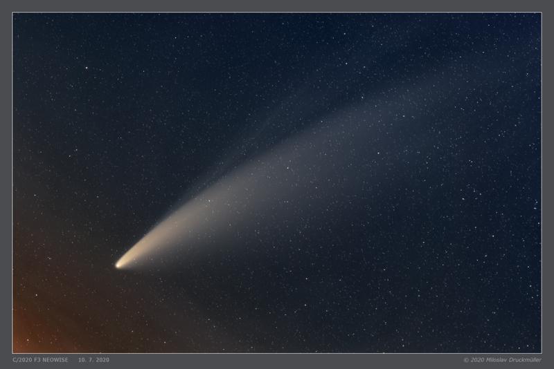 Comet NEOWISE (C/2020 F3) is now sweeping through northern skies. Its developing tails stretch some six degrees across this telescopic field of view, recorded from Brno, Czech Republic before daybreak on July 10. Pushed out by the pressure of sunlight itself, the comet's broad, yellowish dust tail is easiest to see. But the image also captures a fainter, more bluish tail too, separate from the reflective comet dust. The fainter tail is an ion tail, formed as ions from the cometary coma are dragged outward by magnetic fields in the solar wind and fluoresce in the sunlight. In this sharp portrait of our new visitor from the outer Solar System, the tails of comet NEOWISE are reminiscent of the even brighter tails of Hale Bopp, the Great Comet of 1997. Comet NEOWISE from Around the Globe: Notable Images Submitted to APOD
