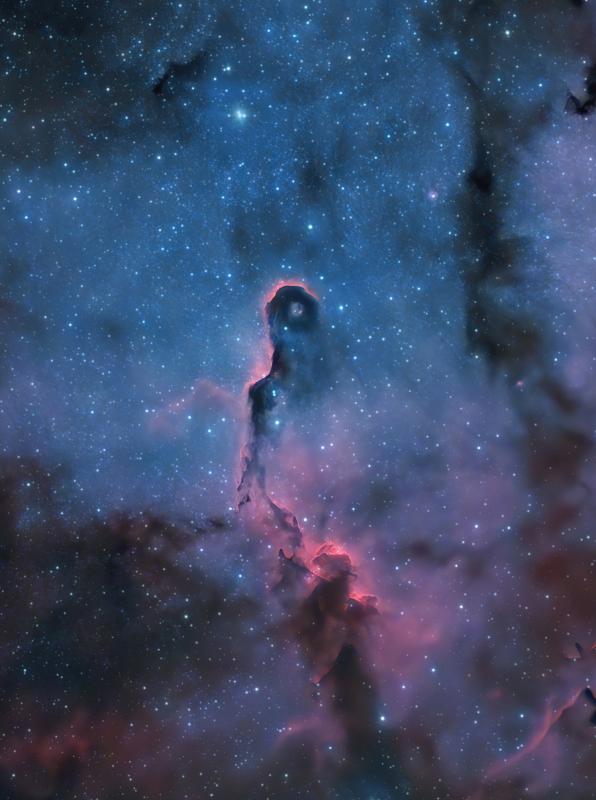 Like an illustration in a galactic Just So Story, the Elephant's Trunk Nebula winds through the emission nebula and young star cluster complex IC 1396, in the high and far off constellation of Cepheus. Also known as vdB 142, the cosmic elephant's trunk is over 20 light-years long. This detailed close-up view was recorded through narrow band filters that transmit the light from ionized hydrogen and oxygen atoms in the region. The resulting composite highlights the bright swept-back ridges that outline pockets of cool interstellar dust and gas. Such embedded, dark, tendril-shaped clouds contain the raw material for star formation and hide protostars within. Nearly 3,000 light-years distant, the relatively faint IC 1396 complex covers a large region on the sky, spanning over 5 degrees. This dramatic scene spans a 1 degree wide field of view though, about the size of 2 Full Moons. Mars 2020 Launch: photos from planet Earth