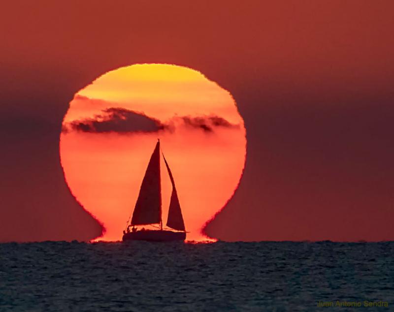 Capturing this sunrise required both luck and timing. First and foremost, precise timing was needed to capture a sailboat crossing right in front of a rising Sun. Additionally, by a lucky coincidence, the background Sun itself appears unusual -- it looks like the Greek letter Omega (Ω). In reality, the Sun remained its circular self -- the Omega illusion was created by sunlight refracting through warm air just above the water. Optically, the feet of the capital Omega are actually an inverted image of the Sun region just above it. Although somewhat rare, optical effects caused by the Earth's atmosphere can make distant objects near the horizon -- including the Sun and Moon -- look quite unusual. This single exposure image was taken over the Mediterranean Sea just over two weeks ago near Valencia, Spain.