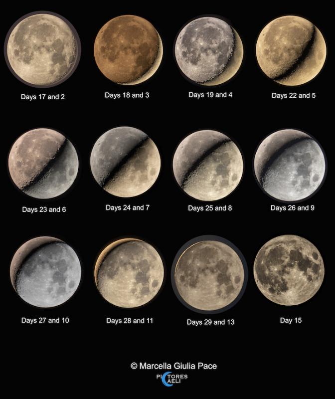 Observe the Moon each night and its visible sunlit portion will gradually change. In phases progressing from New Moon to Full Moon to New Moon again, a lunar cycle or synodic month is completed in about 29.5 days. They look full, but top left to bottom right these panels do show the range of lunar phases for a complete synodic month during August 2019 from Ragusa, Sicily, Italy, planet Earth. For this lunar cycle project the panels organize images of the lunar phases in pairs. Each individual image is paired with another image separated by about 15 days, or approximately half a synodic month. As a result the opposite sunlit portions complete the lunar disk and the shadow line at the boundary of lunar night and day, the terminator, steadily marches across the Moon's familiar nearside. For extra credit, what lunar phase would you pair with the Moon tonight?