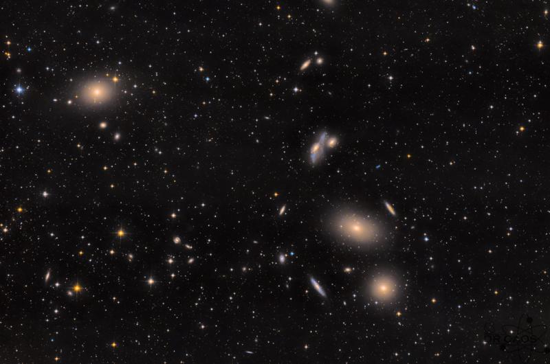 Galaxies of the Virgo Cluster are scattered across this deep telescopic field of view. The cosmic scene spans about three Full Moons, captured in dark skies near Jalisco, Mexico, planet Earth. About 50 million light-years distant, the Virgo Cluster is the closest large galaxy cluster to our own local galaxy group. Prominent here are Virgo's bright elliptical galaxies from the Messier catalog, M87 at the top left, and M84 and M86 seen (bottom to top) below and right of center. M84 and M86 are recognized as part of Markarian's Chain, a visually striking line-up of galaxies vertically on the right side of this frame. Near the middle of the chain lies an intriguing interacting pair of galaxies, NGC 4438 and NGC 4435, known to some as Markarian's Eyes. Of course giant elliptical galaxy M87 dominates the Virgo cluster. It's the home of a super massive black hole, the first black hole ever imaged by planet Earth's Event Horizon Telescope.