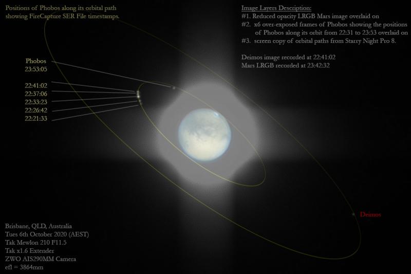 On Halloween fear and dread will stalk your night skies, also known as Phobos and Deimos the moons of Mars. The 2020 opposition of Mars was on October 13, so the Red Planet will still rise shortly after sunset. Near Halloween's Full Moon on the sky, its strange yellowish glow will outshine other stars throughout the night. But the two tiny Martian moons are very faint and in close orbits, making them hard to spot, even with a small telescope. You can find them in this carefully annotated composite view though. The overexposed planet's glare is reduced and orbital paths for inner moon Phobos and outer moon Deimos are overlayed on digitally combined images captured on October 6. The diminutive moons of Mars were discovered in August of 1877 by astronomer Asaph Hall at the US Naval Observatory using the Great Equatorial 26-inch Alvan Clark refractor