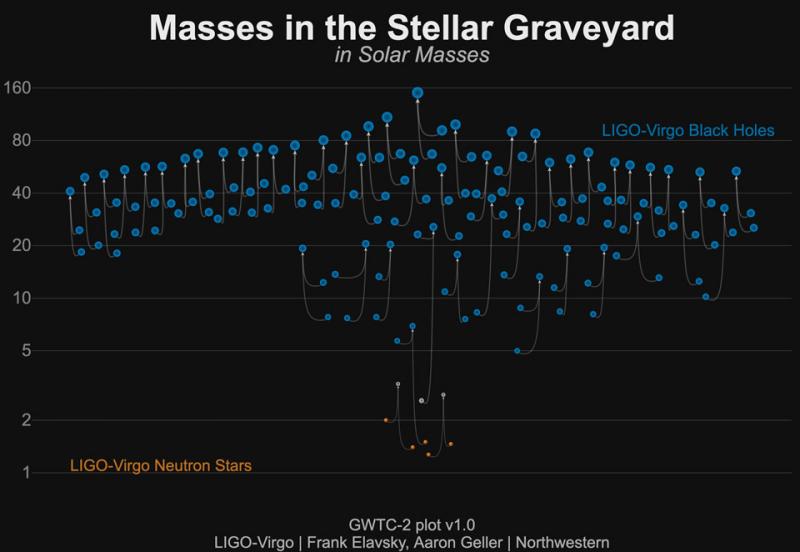 Over fifty gravitational wave events have now been detected. These events mark the distant, violent collisions of two black holes, a black hole and a neutron star, or two neutron stars. Most of the 50 events were detected in 2019 by the LIGO gravitational wave detectors in the USA and the VIRGO detector in Europe. In the featured illustration summarizing the masses of the first 50 events, blue dots indicate higher-mass black holes while orange dots denote lower-mass neutron stars. Astrophysicists are currently uncertain, though, about the nature of events marked in white involving masses that appear to be in the middle -- between two and five solar masses. The night sky in optical light is dominated by nearby and bright planets and stars that have been known since the dawn of humanity. In contrast, the sky in gravitational waves is dominated by distant and dark black holes that have only been known about for less than five years. This contrast is enlightening -- understanding the gravitational wave sky is already reshaping humanity's knowledge not only of star birth and death across the universe, but properties of the universe itself.