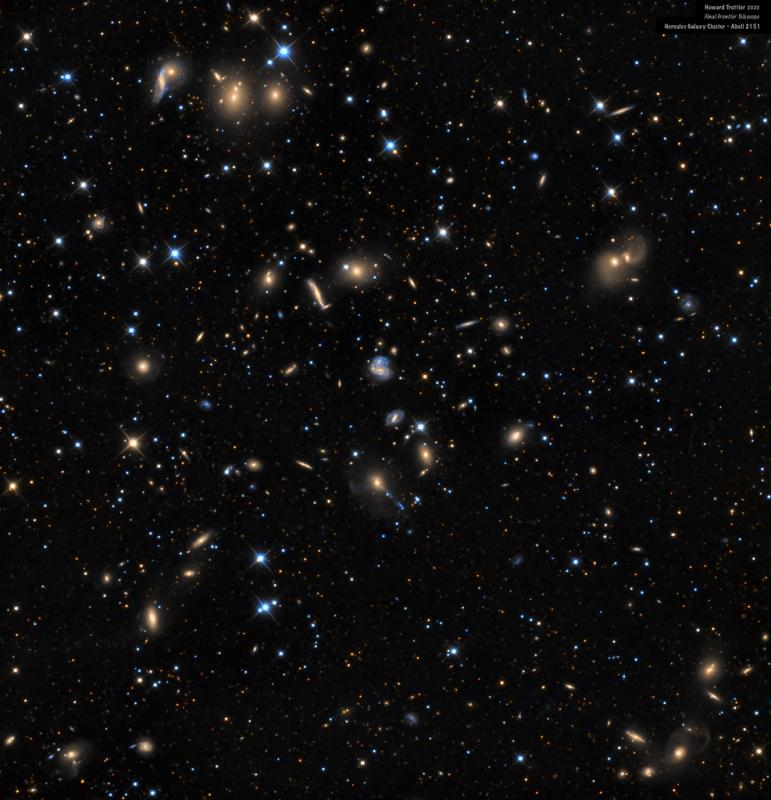 These are galaxies of the Hercules Cluster, an archipelago of island universes a mere 500 million light-years away. Also known as Abell 2151, this cluster is loaded with gas and dust rich, star-forming spiral galaxies but has relatively few elliptical galaxies, which lack gas and dust and the associated newborn stars. The colors in this deep composite image clearly show the star forming galaxies with a blue tint and galaxies with older stellar populations with a yellowish cast. The sharp picture spans about 1/2 degree across the cluster center, corresponding to over 4 million light-years at the cluster's estimated distance. Diffraction spikes around brighter foreground stars in our own Milky Way galaxy are produced by the imaging telescope's mirror support vanes. In the cosmic vista many galaxies seem to be colliding or merging while others seem distorted - clear evidence that cluster galaxies commonly interact. In fact, the Hercules Cluster itself may be seen as the result of ongoing mergers of smaller galaxy clusters and is thought to be similar to young galaxy clusters in the much more distant, early Universe.