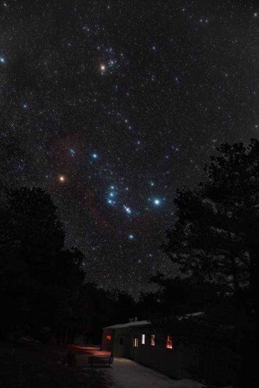 Orion always seems to come up sideways on northern winter evenings. Those familiar stars of the constellation of the Hunter are caught above the trees in this colorful night skyscape. Not a star at all but still visible to eye, the Great Nebula of Orion shines below the Hunter's belt stars. The camera's exposure reveals the stellar nursery's faint pinkish glow. Betelgeuse, giant star at Orion's shoulder, has the color of warm and cozy terrestrial lighting, but so does another familiar stellar giant, Aldebaran. Alpha star of the constellation Taurus the Bull, Aldebaran anchors the recognizable V-shape traced by the Hyades Cluster toward the top of the starry frame.