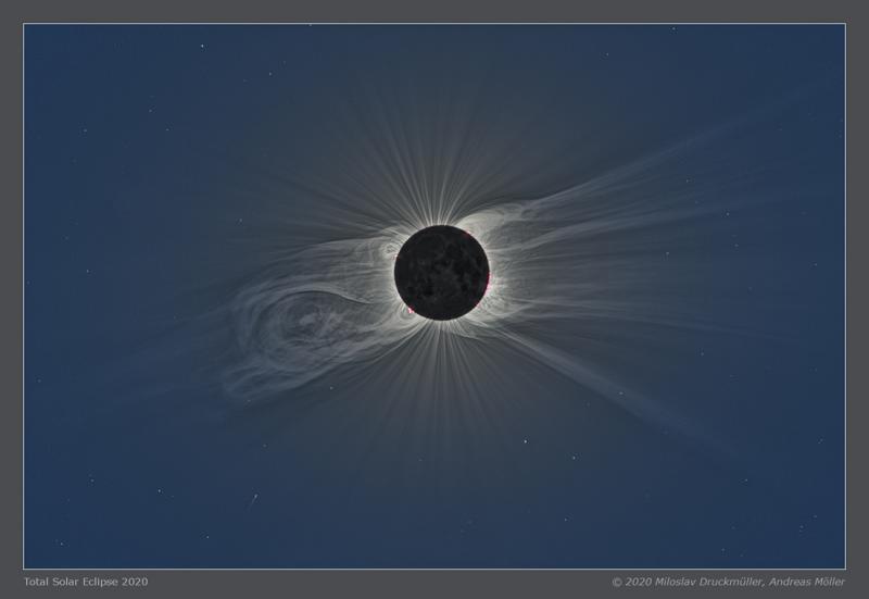 Along a narrow path crossing southern South America through Chile and Argentina, the final New Moon of 2020 moved in front of the Sun on December 14 in the year's only total solar eclipse. Within about 2 days of perigee, the closest point in its elliptical orbit, the New Moon's surface is faintly lit by earthshine in this dramatic composite view. The image is a processed composite of 55 calibrated exposures ranging from 1/640 to 3 seconds. Covering a large range in brightness during totality, it reveals the dim lunar surface and faint background stars, along with planet-sized prominences at the Sun's edge, an enormous coronal mass ejection, and sweeping coronal structures normally hidden in the Sun's glare. Look closely for an ill-fated sungrazing Kreutz family comet (C/2020 X3 SOHO) approaching from the lower left, at about the 7 o'clock position. In 2021 eclipse chasers will see an annular solar eclipse coming up on June 10. They'll have to wait until December 4 for the only total solar eclipse in 2021 though. That eclipse will be total along a narrow path crossing the southernmost continent of Antarctica.