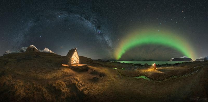What are these two giant arches across the sky? Perhaps the more familiar one, on the left, is the central band of our Milky Way Galaxy. This grand disk of stars and nebulas here appears to encircle much of the southern sky. Visible below the stellar arch is the rusty-orange planet Mars and the extended Andromeda galaxy. For a few minutes during this cold artic night, a second giant arch appeared to the right, encircling part of the northern sky: an aurora. Auroras are much closer than stars as they are composed of glowing air high in Earth's atmosphere. Visible outside the green auroral arch is the group of stars popularly known as the Big Dipper. The featured digital composite of 18 images was captured in mid-December over the in Norway. APOD Year in Review (2020): RJN's Night Sky Network Lecture