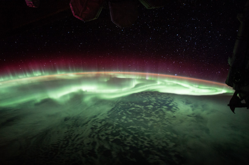 Like salsa verde on your favorite burrito, a green aurora slathers up the sky in this 2017 June 25 snapshot from the International Space Station. About 400 kilometers (250 miles) above Earth, the orbiting station is itself within the upper realm of the auroral displays. Aurorae have the signature colors of excited molecules and atoms at the low densities found at extreme altitudes. Emission from atomic oxygen dominates this view. The tantalizing glow is green at lower altitudes, but rarer reddish bands extend above the space station's horizon. The orbital scene was captured while passing over a point south and east of Australia, with stars above the horizon at the right belonging to the constellation Canis Major, Orion's big dog. Sirius, alpha star of Canis Major, is the brightest star near the Earth's limb.