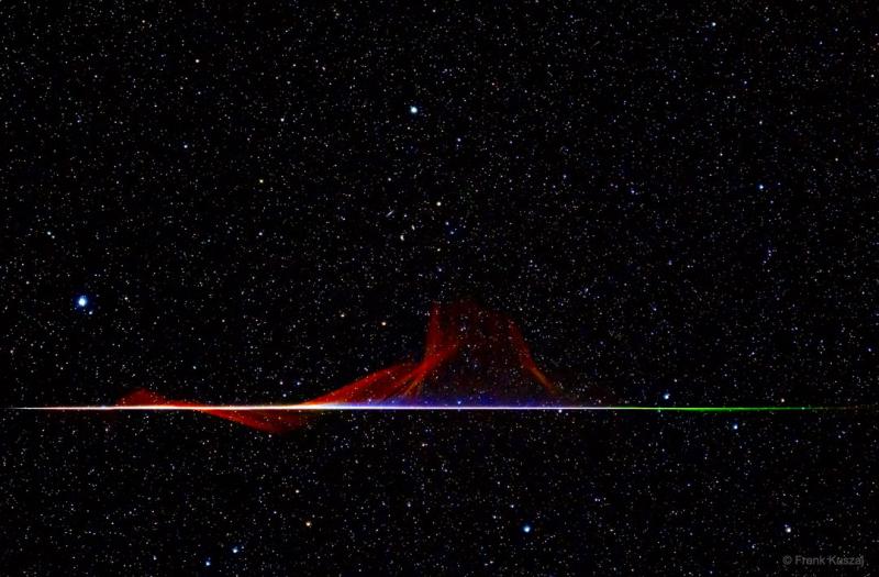 Meteors can be colorful. While the human eye usually cannot discern many colors, cameras often can. Pictured is a Quadrantids meteor captured by camera over Missouri, USA, early this month that was not only impressively bright, but colorful. The radiant grit, likely cast off by asteroid 2003 EH1, blazed a path across Earth's atmosphere. Colors in meteors usually originate from ionized elements released as the meteor disintegrates, with blue-green typically originating from magnesium, calcium radiating violet, and nickel glowing green. Red, however, typically originates from energized nitrogen and oxygen in the Earth's atmosphere. This bright meteoric fireball was gone in a flash -- less than a second -- but it left a wind-blown ionization trail that remained visible for several minutes. APOD is available via Facebook: in English, Catalan and Portuguese