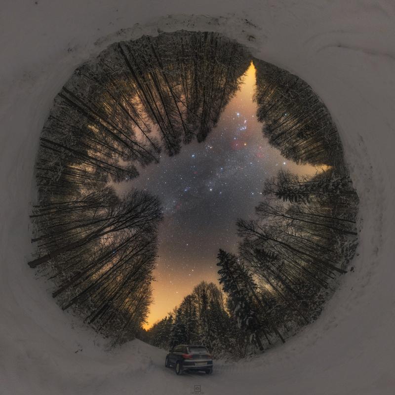 Snow blankets the ground in this serene forest and sky view. Assembled in a 360 degree panoramic projection, the mosaicked frames were captured at January's end along a quiet country road near Siemiony, northeastern Poland, planet Earth. The night was cold and between trees reaching toward the sky shine the stars and nebulae of the northern winter Milky Way. Near zenith is bright star Capella, a mere 43 light-years above the tree tops. Alpha star of the constellation Auriga the Charioteer and part of the winter hexagon asterism, Capella is a well-studied double star system. Follow the Milky Way above and right of Capella and you might spot the familiar stars of Orion in the northern winter night.