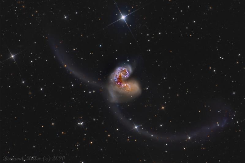 Some 60 million light-years away in the southerly constellation Corvus, two large galaxies are colliding. Stars in the two galaxies, cataloged as NGC 4038 and NGC 4039, very rarely collide in the course of the ponderous cataclysm that lasts for hundreds of millions of years. But the galaxies' large clouds of molecular gas and dust often do, triggering furious episodes of star formationi near the center of the cosmic wreckage. Spanning over 500 thousand light-years, this stunning view also reveals new star clusters and matter flung far from the scene of the accident by gravitational tidal forces. The remarkably sharp ground-based image includes narrowband data that highlights the characteristic red glow of atomic hydrogen gas in star-forming regions. The suggestive overall visual appearance of the extended arcing structures gives the galaxy pair its popular name - The Antennae.