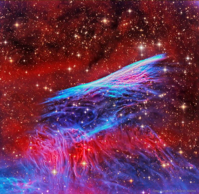 This supernova shock wave plows through interstellar space at over 500,000 kilometers per hour. Near the middle and moving up in this sharply detailed color composite, thin, bright, braided filaments are actually long ripples in a cosmic sheet of glowing gas seen almost edge-on. Cataloged as NGC 2736, its elongated appearance suggests its popular name, the Pencil Nebula. The Pencil Nebula is about 5 light-years long and 800 light-years away, but represents only a small part of the Vela supernova remnant. The Vela remnant itself is around 100 light-years in diameter, the expanding debris cloud of a star that was seen to explode about 11,000 years ago. Initially, the shock wave was moving at millions of kilometers per hour but has slowed considerably, sweeping up surrounding interstellar material. In the featured narrow-band, wide field image, red and blue colors track, primarily, the characteristic glows of ionized hydrogen and oxygen atoms, respectively. Portal Universe: Random APOD Generator