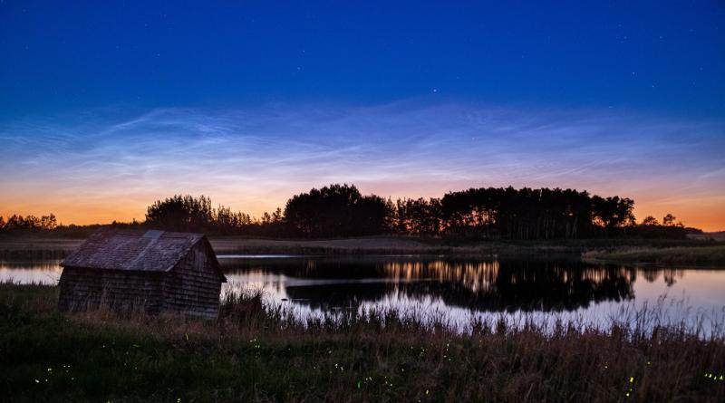 Nights grow shorter and days grow longer as the summer solstice approaches in the north. Usually seen at high latitudes in summer months, noctilucent or night shining clouds begin to make their appearance. Drifting near the edge of space about 80 kilometers above the Earth's surface, these icy clouds were still reflecting the sunlight on June 14. Though the Sun was below the horizon as seen north of Forrest, Manitoba, Canada, they were caught in a single exposure of a near midnight twilight sky. Multiple exposures of the foreground track the lower altitude flash of fireflies, another fleeting apparition shining in the summer night.