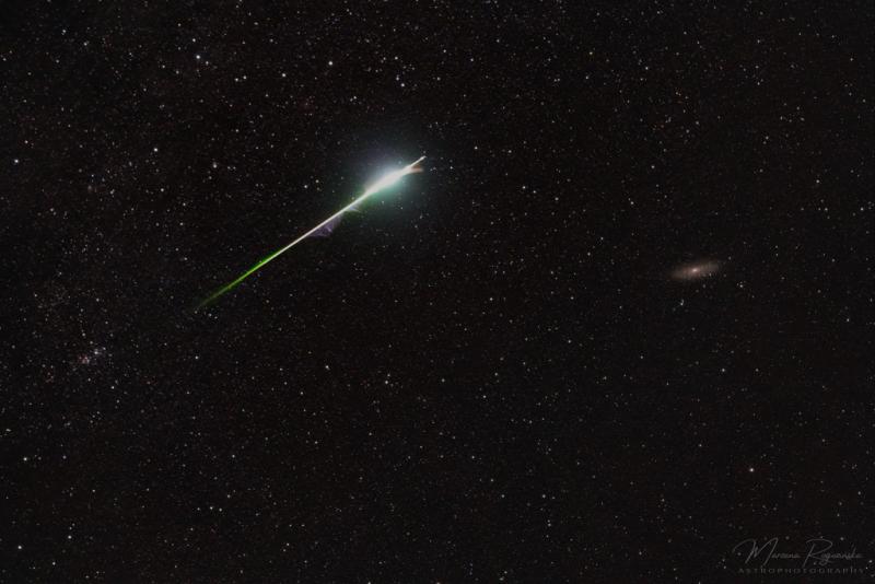Stars in our own Milky Way Galaxy are scattered through this eye-catching field of view. From the early hours after midnight on August 13, the 30 second exposure of the night sky over Busko-Zdroj, Poland records the colorful and bright trail of a Perseid meteor. Seen near the peak of the annual Perseid meteor shower it flashes from lower left to upper right. The hurtling grain of cosmic sand, a piece of dust from periodic comet Swift-Tuttle, vaporized as it passed through planet Earth's atmosphere at almost 60 kilometers per second. Just above and right of center, well beyond the stars of the Milky Way, lies the island universe known as M31 or the Andromeda Galaxy. The Andromeda Galaxy is the most distant object easily visible to the naked-eye, about 2.5 million light-years away. The visible meteor trail begins only about 100 kilometers above Earth's surface, though. It points back to the meteor shower radiant in the constellation Perseus off the lower left edge of the frame. Follow this bright perseid meteor trail below and left to the stars of NGC 869and NGC 884, the double star cluster in Perseus. Notable APOD Image Submissions: Perseid Meteor Shower 2021