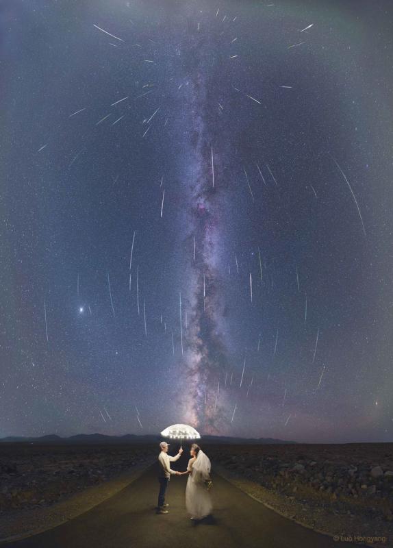 Comet dust rained down on planet Earth last week, streaking through dark skies in the annual Perseid meteor shower. The featured picture is a composite of many images taken from the same location over the peak night of the Perseids. The umbrella was not needed as a shield from meteors, since they almost entirely evaporate high in the Earth's atmosphere. Many of the component images featured individual Perseids, while one image featured the foreground near Jiuquan City, Gansu Province, China. The stellar background includes the central band of our Milky Way Galaxy, appearing nearly vertical, as well as the planets Jupiter and Saturn on the left. Although the comet dust particles are traveling parallel to each other, the resulting shower meteors clearly seem to radiate from a single point on the sky -- the radiant in the eponymous constellation Perseus. The image captured so long an angular field that the curvature of the sky is visible in the trajectory of the Perseids. Notable APOD Image Submissions: Perseid Meteor Shower 2021