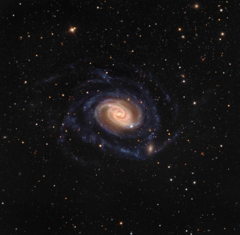 About 70 million light-years distant, gorgeous spiral galaxy NGC 289 is larger than our own Milky Way. Seen nearly face-on, its bright core and colorful central disk give way to remarkably faint, bluish spiral arms. The extensive arms sweep well over 100 thousand light-years from the galaxy's center. At the lower right in this sharp, telescopic galaxy portrait the main spiral arm seems to encounter a small, fuzzy elliptical companion galaxy interacting with enormous NGC 289. Of course spiky stars are in the foreground of the scene. They lie within the Milky Way toward the southern constellation Sculptor.