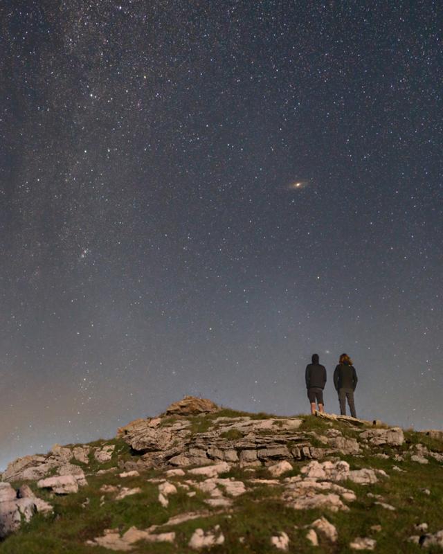 On an August night two friends enjoyed this view after a day's hike on the Plateau d'Emparis in the French Alps. At 2400 meters altitude the sky was clear. Light from a setting moon illuminates the foreground captured in the simple vertical panorama of images. Along the plane of our Milky Way galaxy stars of Cassiopeia and Perseus shine along the panorama's left edge. But seen as a faint cloud with a brighter core, the Andromeda galaxy, stands directly above the two friends in the night. The nearest large spiral galaxy, Andromeda is about 2.5 million light-years beyond the stars of the Milky Way. Adding to the evening's shared extragalactic perspective, the fainter fuzzy spot in the sky right between them is M33, also known as the Triangulum galaxy. Third largest in the local galaxy group, after Andromeda and Milky Way, the Triangulum galaxy is about 3 million light-years distant. On that night, the two friends stood about 3 light-nanoseconds apart.