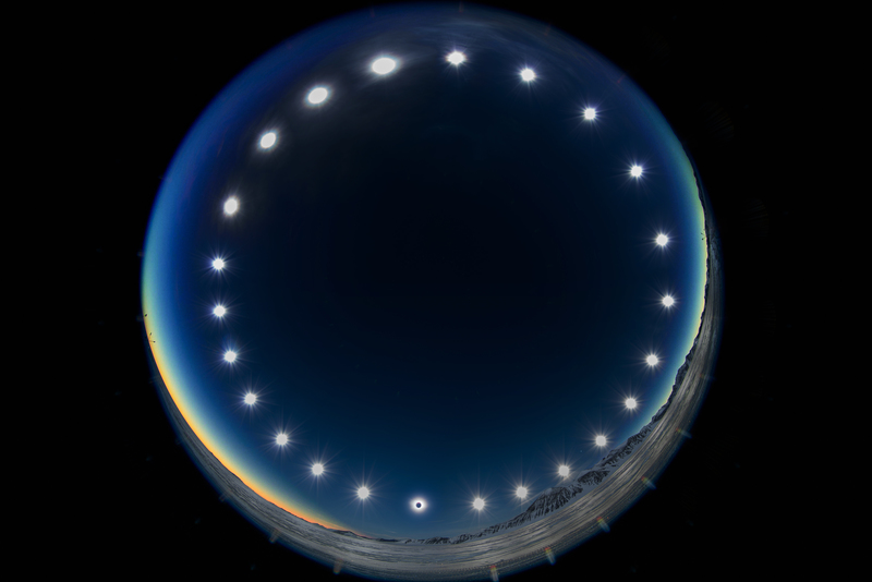During polar day, in Arctic and Antarctic summer, the Sun stays above the horizon for periods of 24 hours or more. Recorded on December 4, this fisheye timelapse image tracks the Sun in multiple frames as it completes a circle in the summer sky above Union Glacier, Antarctica. Of course on that date, Union Glacier's sky did grow dark even though the Sun was above the horizon. Captured during the brief period of totality, an eclipsed Sun is at bottom center of the composite view. Near the edge of the total eclipse path across planet Earth, the Moon's shadow darkens the sky above.