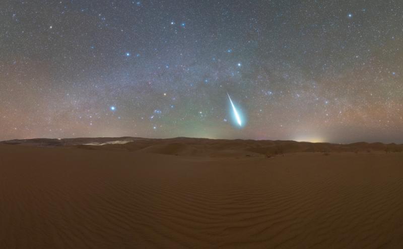 An arid expanse of the Tengger Desert in north-central China, planet Earth fills the foreground of this starry scene. A widefield panoramic view, it was recorded shortly after moonset in the local predawn hours of December 14. Pictured in the still dark sky, stars of the northern winter hexagon surround a luminous Milky Way. Seen near the peak of the annual meteor shower, the startling flash of a bright Geminid fireball meteor was also captured on that night. Above the western horizon and just below bright star Capella, its dagger-like trail points back to the meteor shower's radiant in Gemini. Of course, the constellation Gemini is easy to spot. Its twin bright stars, bluish Castor and yellowish Pollux are near top center in the frame.