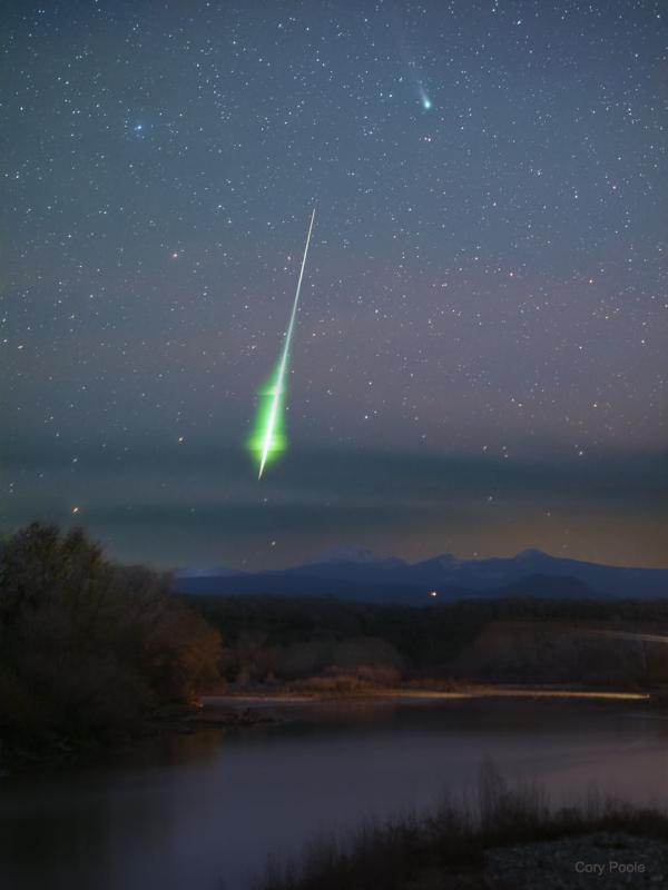 This picture was supposed to feature a comet. Specifically, a series of images of the brightest comet of 2021 were being captured: Comet Leonard. But the universe had other plans. Within a fraction of a second, a meteor so bright it could be called a fireball streaked through just below the comet. And the meteor's flash was even more green than the comet's coma. The cause of the meteor's green was likely magnesium evaporating from the meteor's pebble-sized core, while the cause of the comet's green was likely diatomic carbon recently ejected from the comet's city-sized nucleus. The images were taken 10 days ago over the Sacramento River and Mt. Lassen in California, USA. The fireball was on the leading edge of this year's Geminid Meteor Shower -- which peaked a few days later. Comet Leonard is now fading after reaching naked-eye visibility last week -- but now is moving into southern skies. Almost Hyperspace: Random APOD Generator