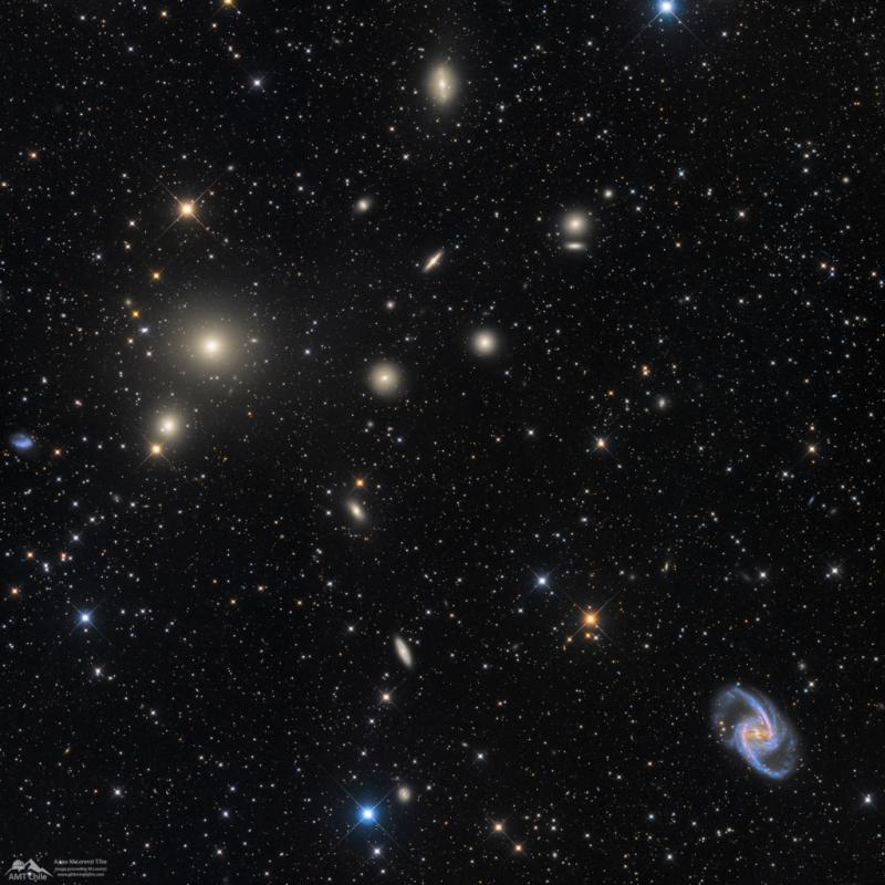 Named for the southern constellation toward which most of its galaxies can be found, the Fornax Cluster is one of the closest clusters of galaxies. About 62 million light-years away, it is almost 20 times more distant than our neighboring Andromeda Galaxy, and only about 10 percent farther than the better known and more populated Virgo Galaxy Cluster. Seen across this two degree wide field-of-view, almost every yellowish splotch on the image is an elliptical galaxy in the Fornax cluster. Elliptical galaxies NGC 1399 and NGC 1404 are the dominant, bright cluster members toward the upper left (but not the spiky foreground stars). A standout barred spiral galaxy NGC 1365 is visible on the lower right as a prominent Fornax cluster member.