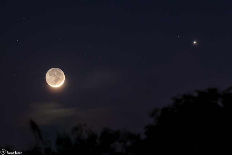 ven though Jupiter was the only planet visible in the evening sky on February 2, it shared the twilight above the western horizon with the Solar System's brightest moons. In a single exposure made just after sunset, the Solar System's ruling gas giant is at the upper right in this telephoto field-of-view from Cancun, Mexico. The snapshot also captures our fair planet's own natural satellite in its young crescent phase. The Moon's disk looms large, its familiar face illuminated mostly by earthshine. But the four points of light lined-up with Jupiter are Jupiter's own large Galilean moons. Top to bottom are Ganymede, [Jupiter], Io, Europa, and Callisto. Ganymede, Io, and Callisto are physically larger than Earth's Moon while water world Europa is only slightly smaller.