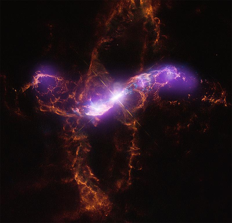 Variable star R Aquarii is actually an interacting binary star system, two stars that seem to have a close symbiotic relationship. Centered in this space-based optical/x-ray composite image it lies about 710 light years away. The intriguing system consists of a cool red giant star and hot, dense white dwarf star in mutual orbit around their common center of mass. With binoculars you can watch as R Aquarii steadily changes its brightness over the course of a year or so. The binary system's visible light is dominated by the red giant, itself a Mira-type long period variable star. But material in the cool giant star's extended envelope is pulled by gravity onto the surface of the smaller, denser white dwarf, eventually triggering a thermonuclear explosion, blasting material into space. Astronomers have seen such outbursts over recent decades. Evidence for much older outbursts is seen in these spectacular structures spanning almost a light-year as observed by the Hubble Space Telescope (in red and blue). Data from the Chandra X-ray Observatory (in purple) shows the X-ray glow from shock waves created as a jet from the white dwarf strikes surrounding material.
